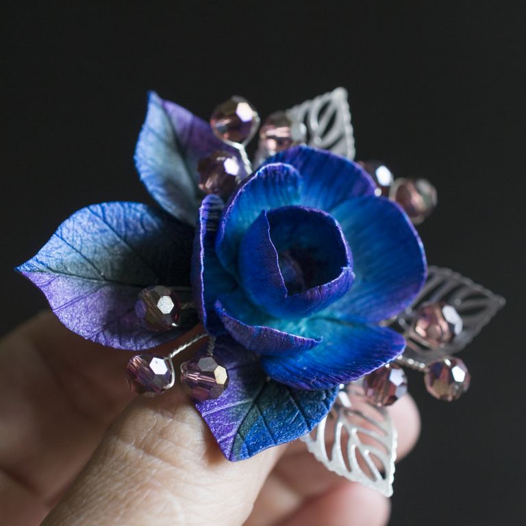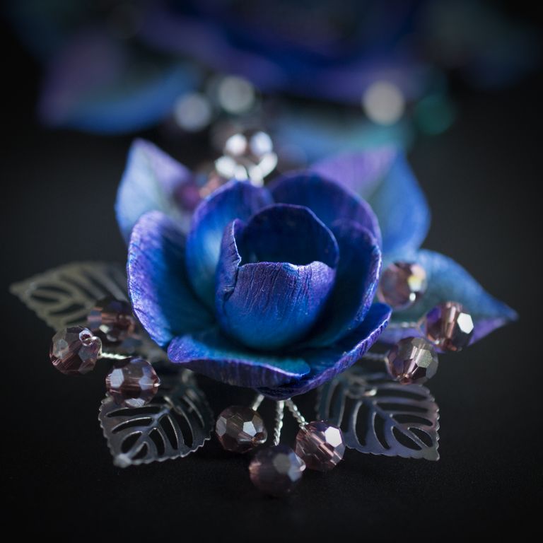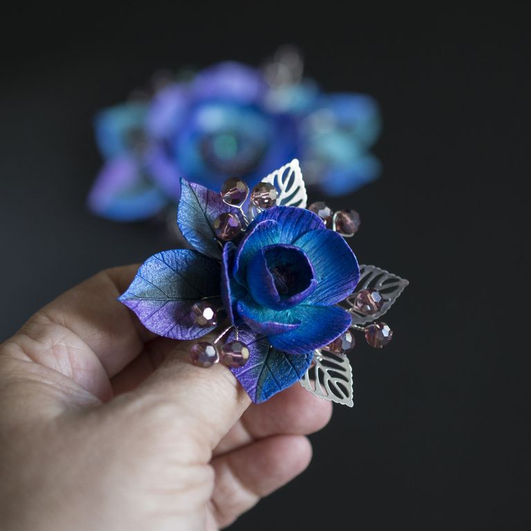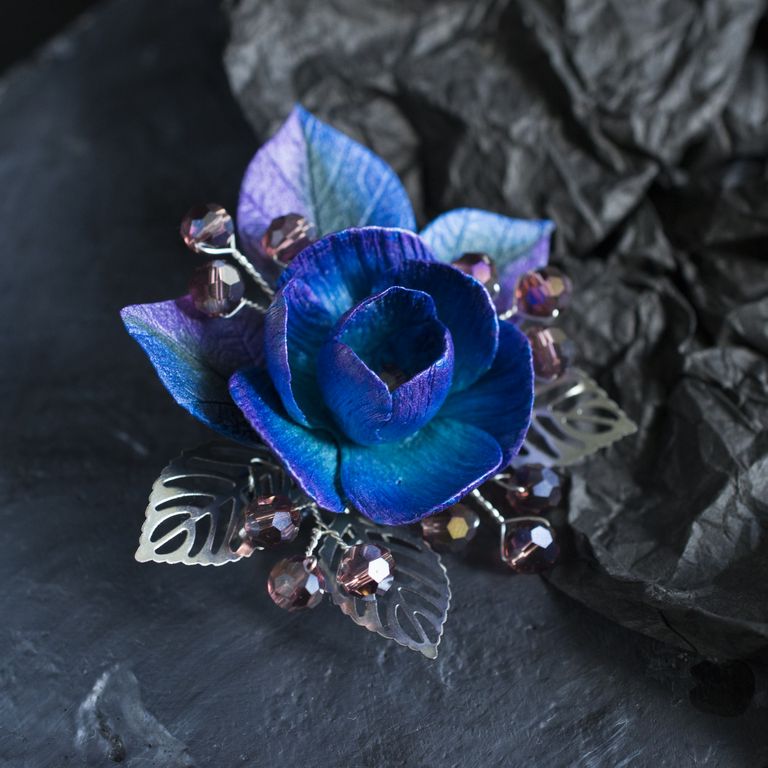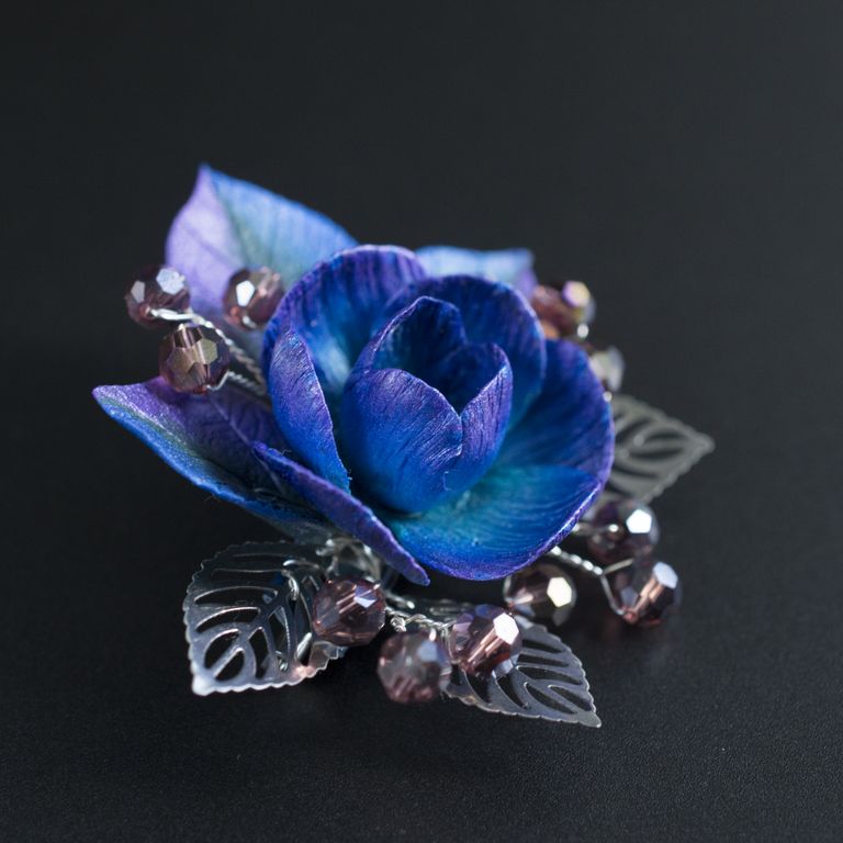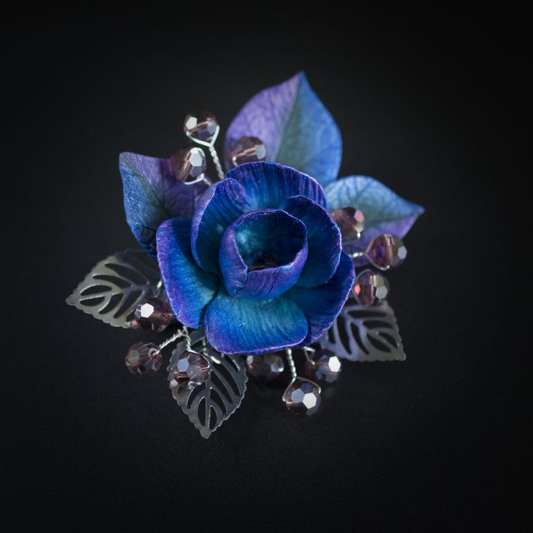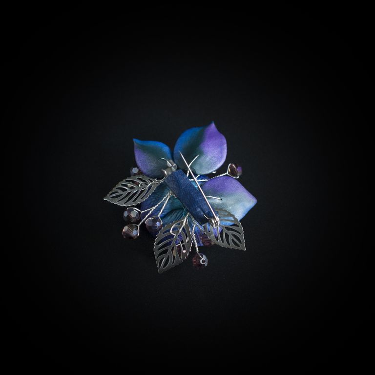 материал: основа для броши из нержавеющей стали, полимерная глина, посеребренная проволока, стеклянные бусины, стеклянный бисер, листья из нержавеющей стали.