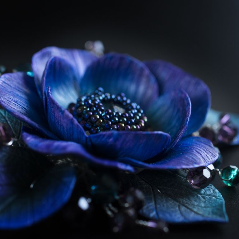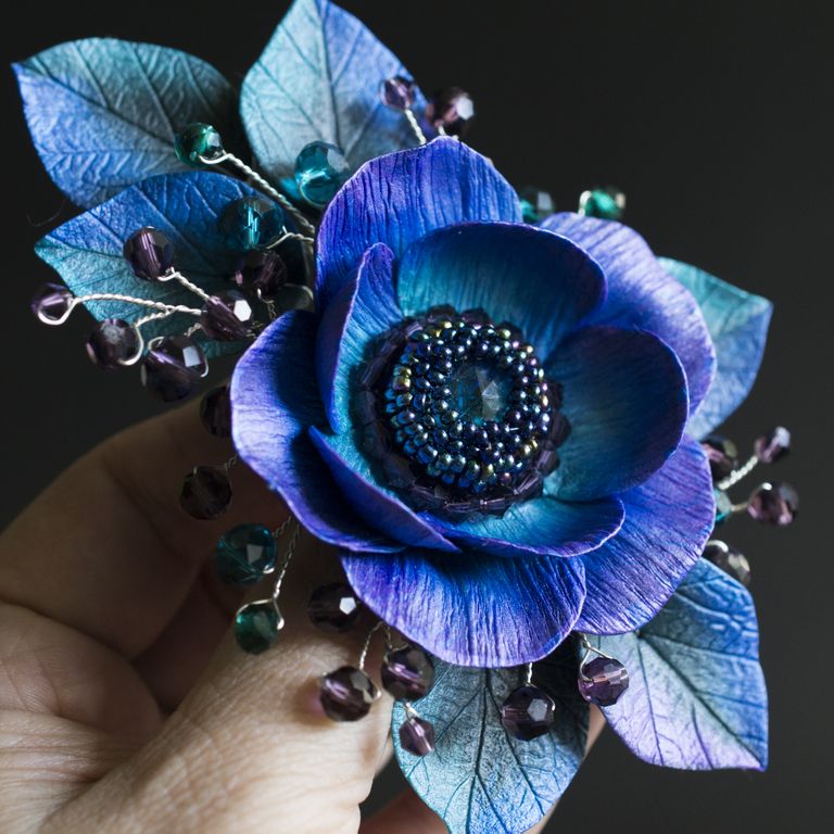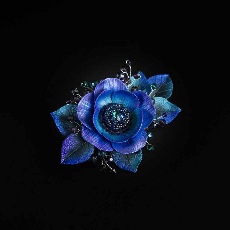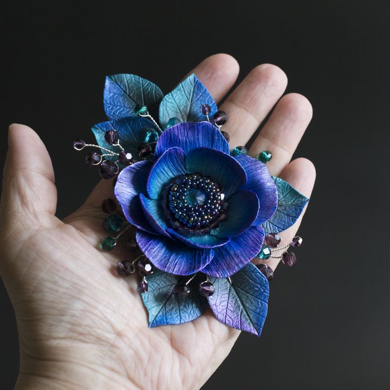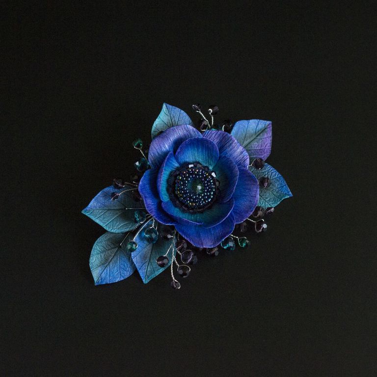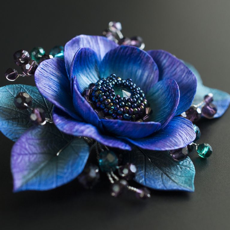 материал: основа для броши из нержавеющей стали, полимерная глина, посеребренная проволока, стеклянные бусины, стеклянный бисер, стеклянная страза.
