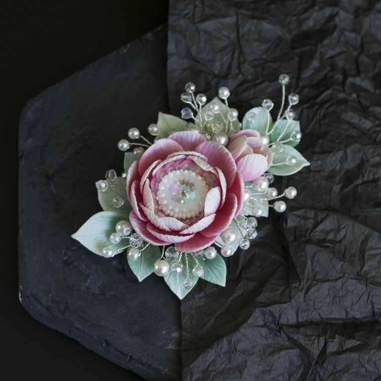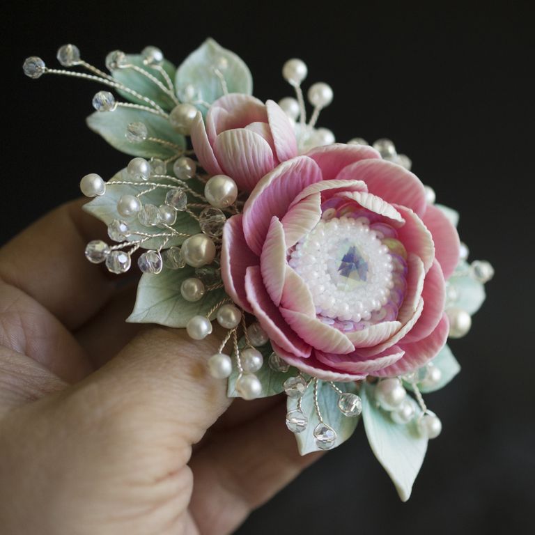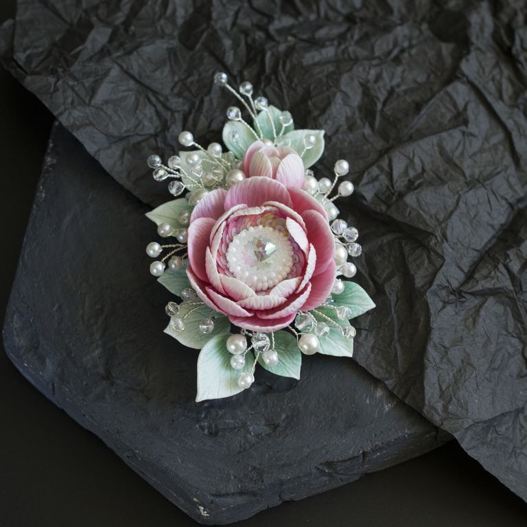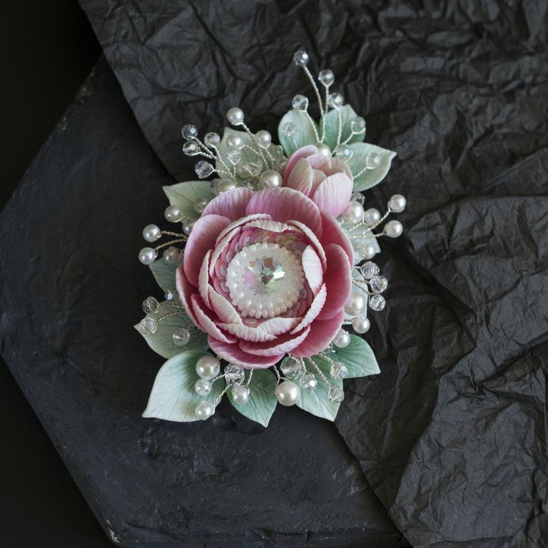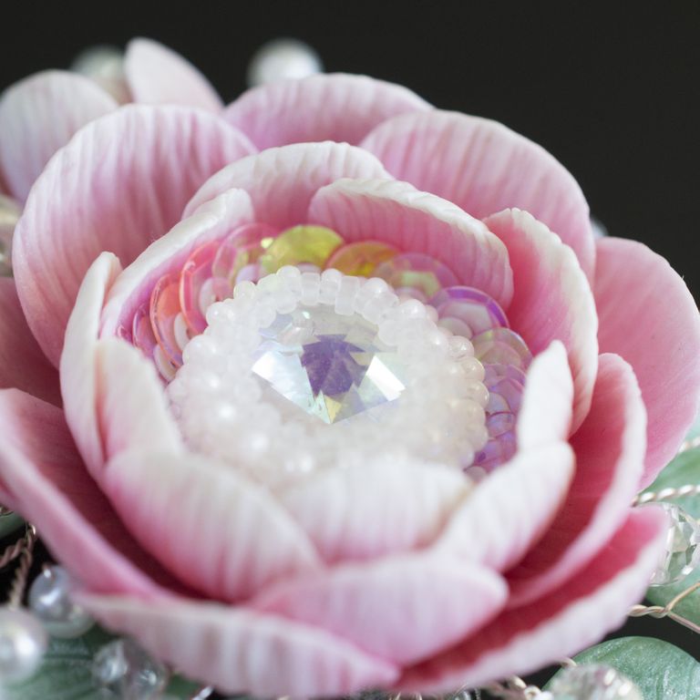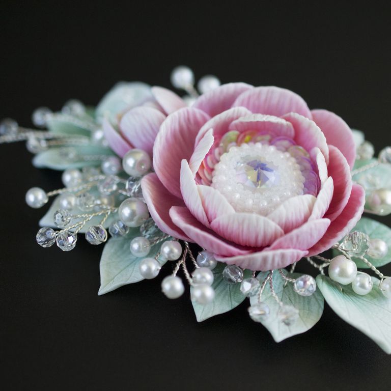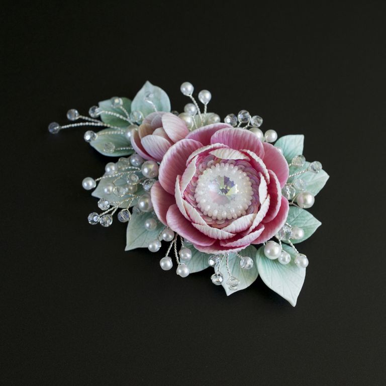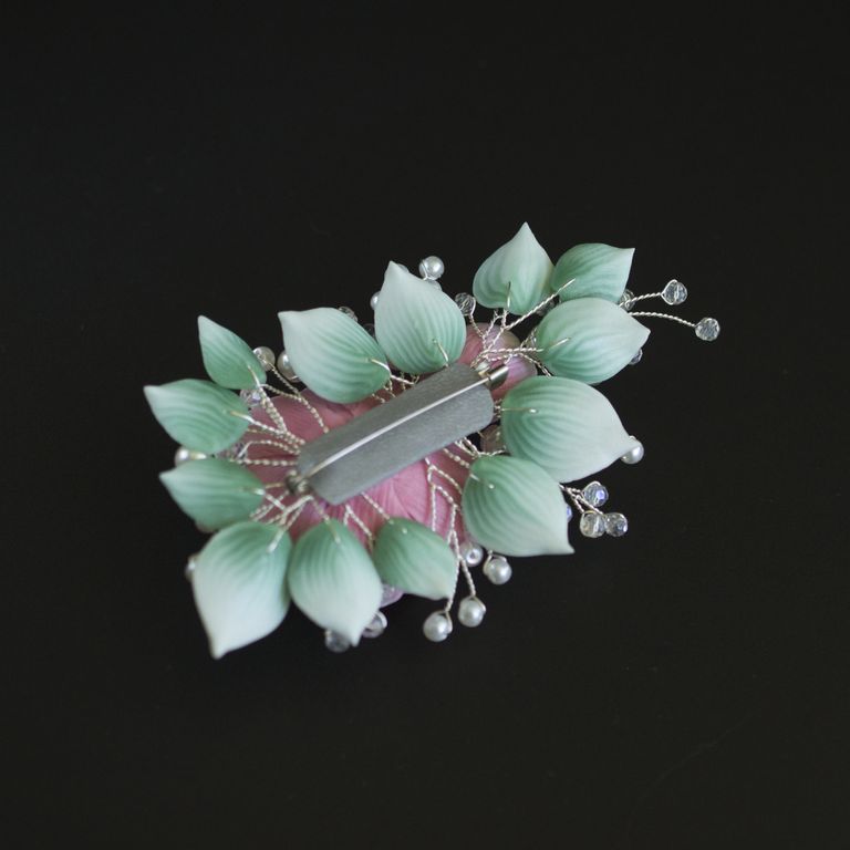 материал: основа для броши из нержавеющей стали, полимерная глина, посеребренная проволока, стеклянные бусины, стеклянный бисер, стеклянная страза.